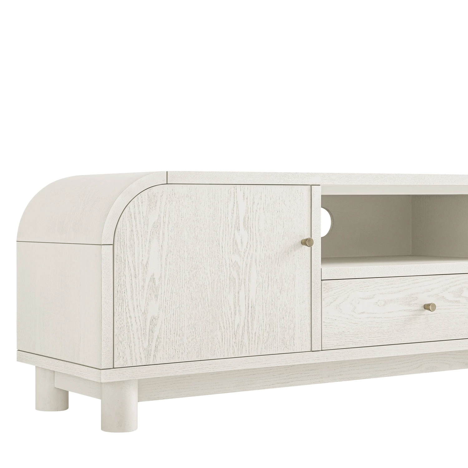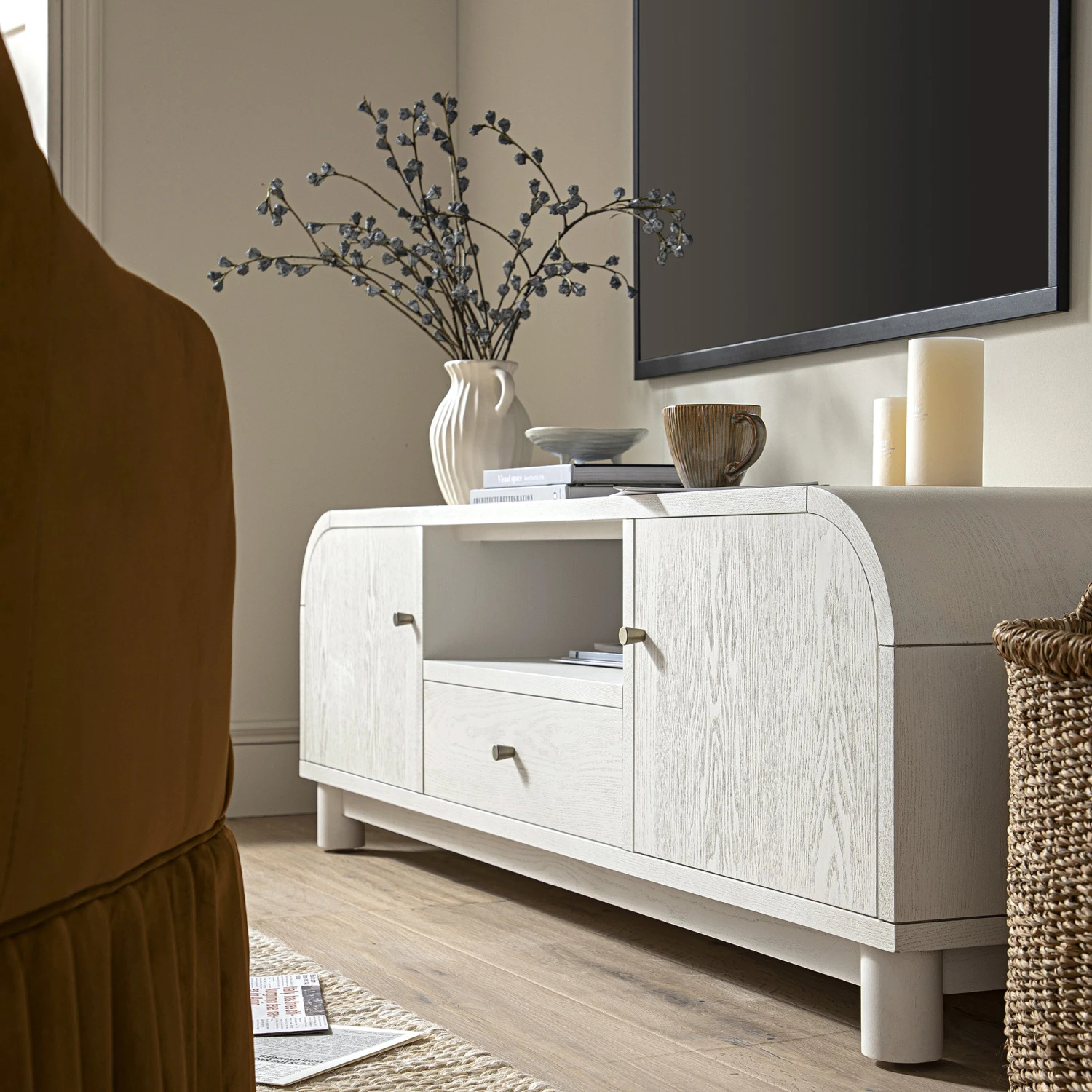 - Complete the look: Pictured with our Maude TV Unit is our Calliope Skirted Armchair in Cinnamon Velvet and our Aurora Hand Braided Cream Jute Rugย