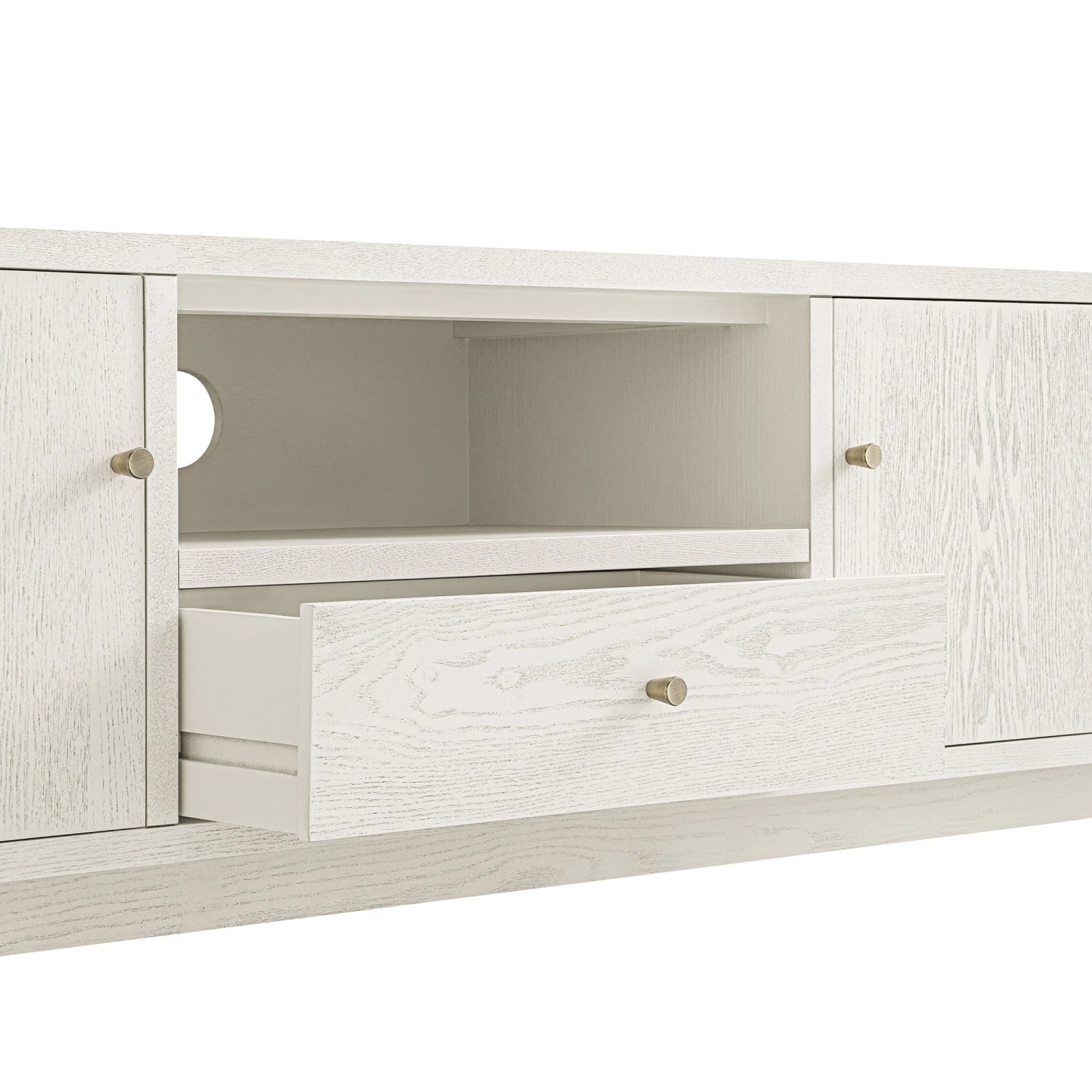 - Our Maude wide TV unit features solid ash veneer, paired with antique brass effect metal handles.
