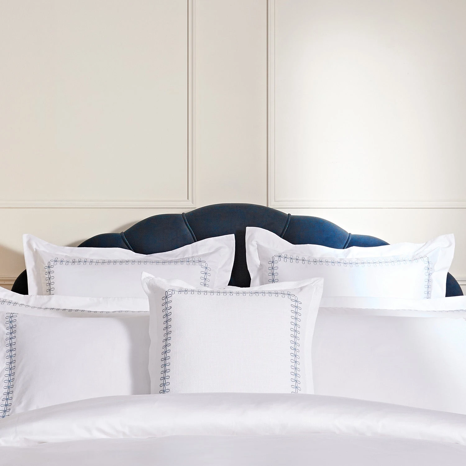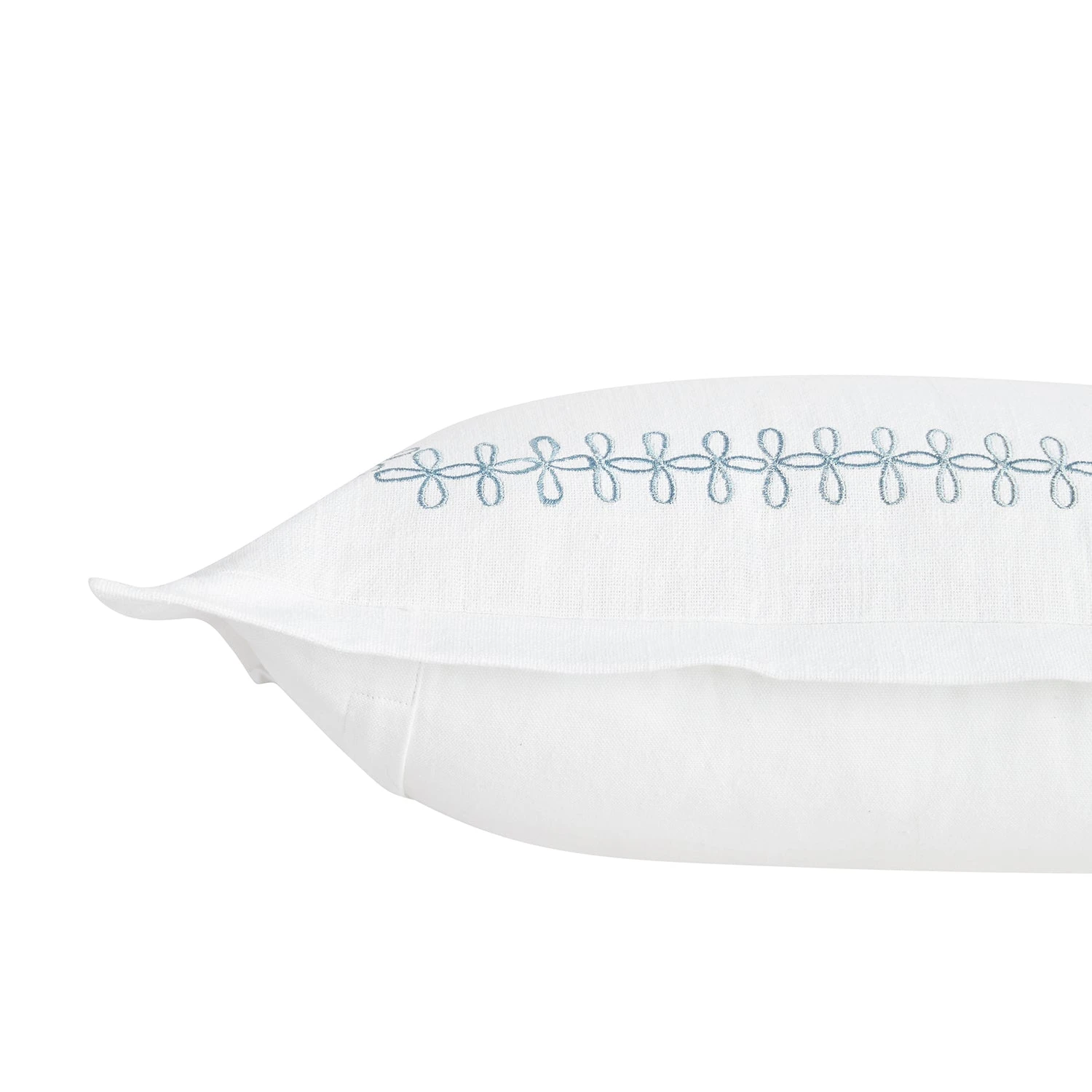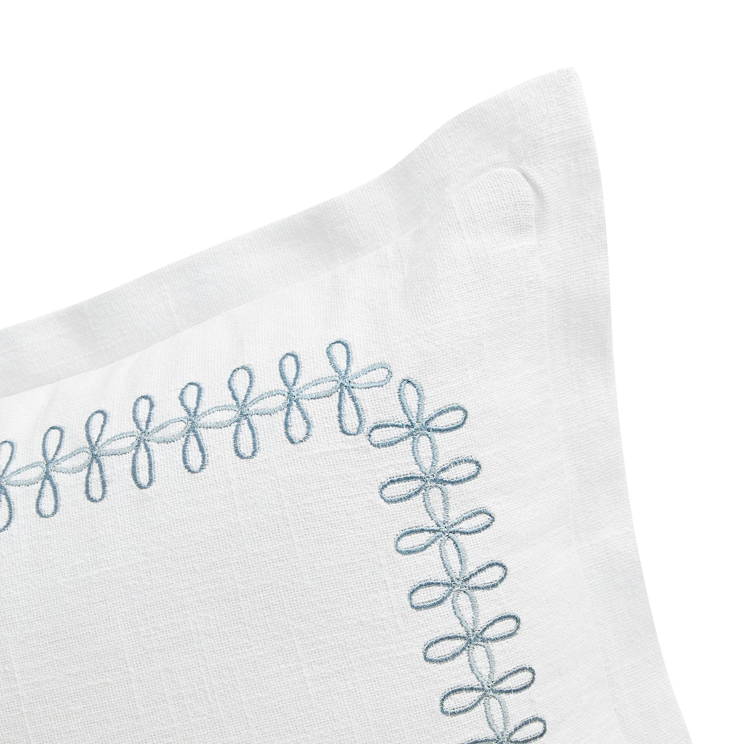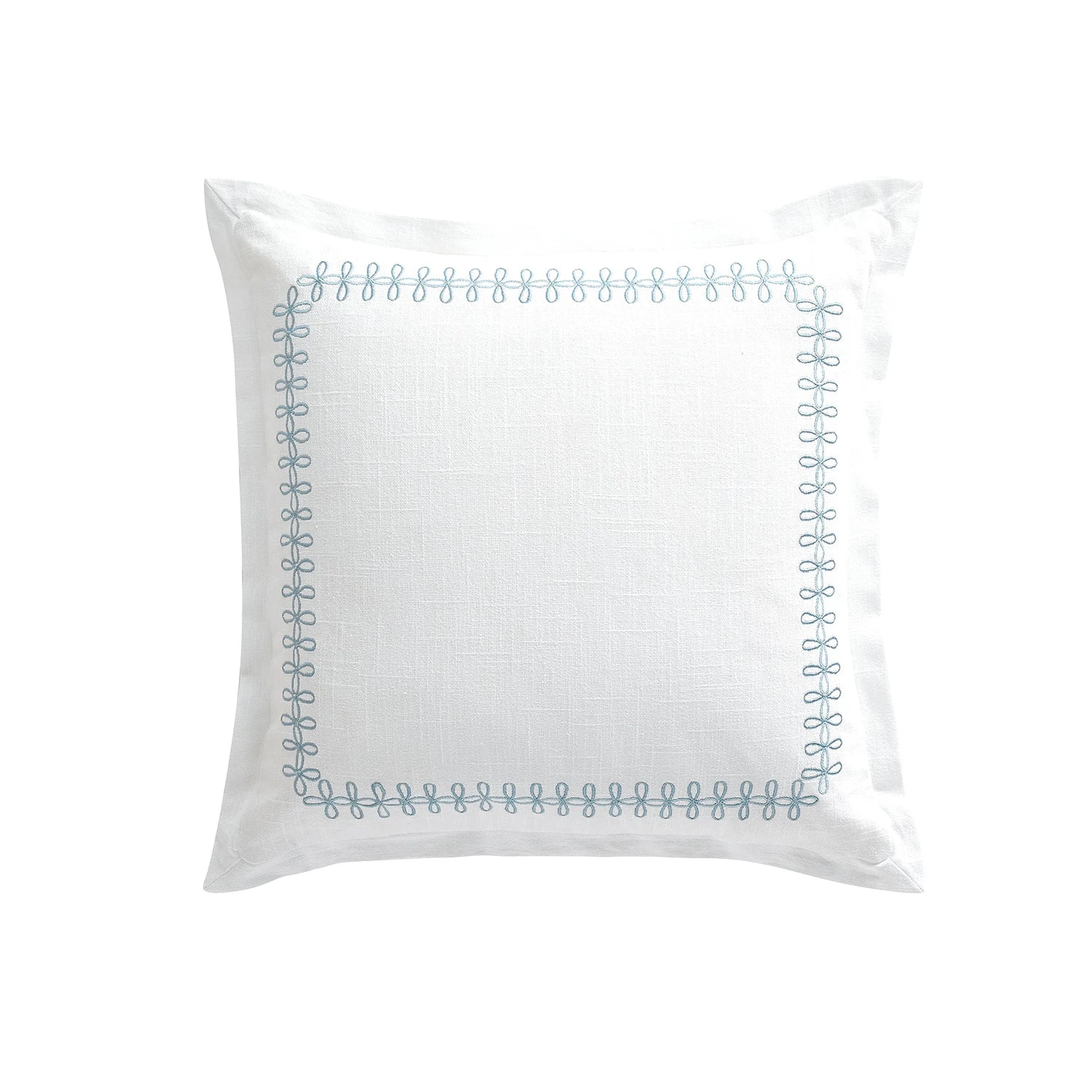 The Milano Air Force Blue Knot Embroidered Cotton Cushion brings serenity and class to any interior, from traditional to modern. This piece features a crisp white cotton slub base accented by a sophisticated interlacing knot pattern border in a calming air force blue, evocative of heritage craftsmanship and understated luxury.