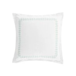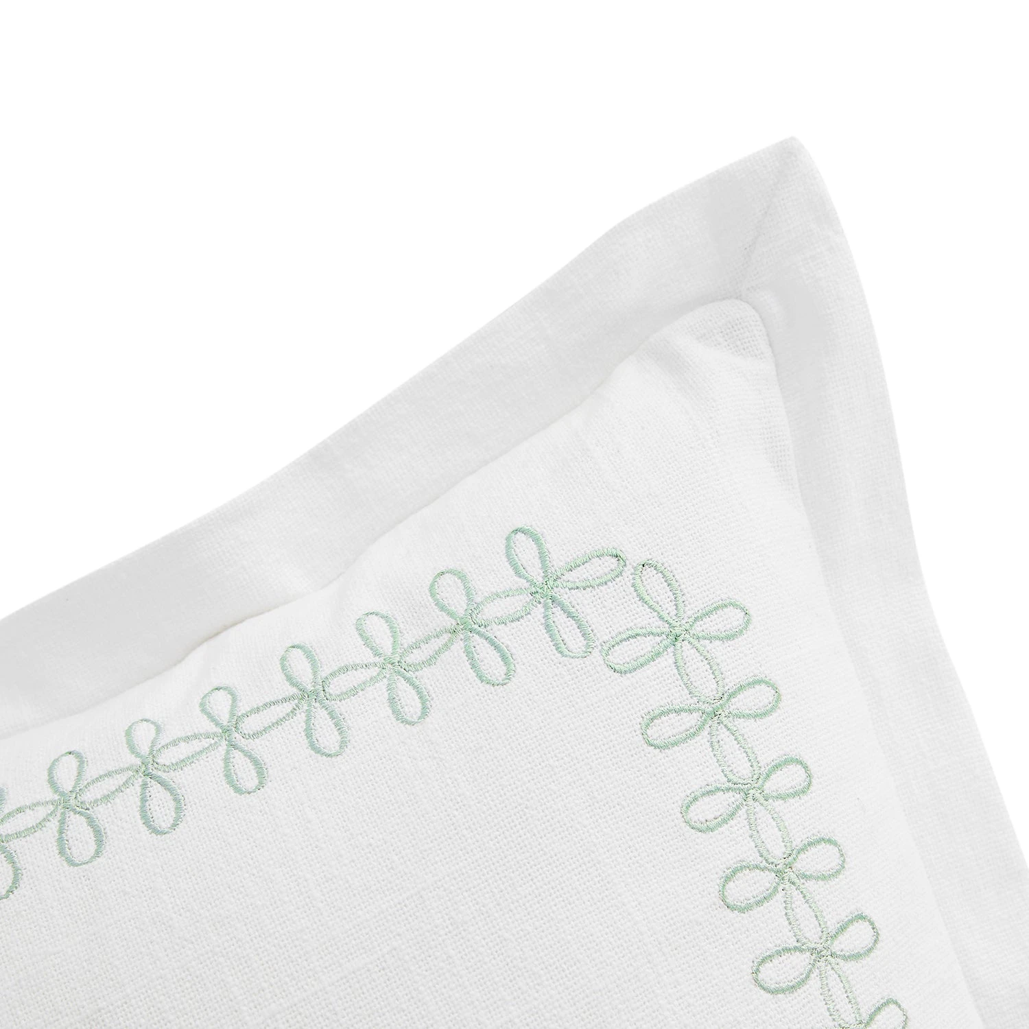 Crafted from a premium crisp white cotton slub, this cushion features a striking sea spray green embroidered border. The interlacing knot pattern is meticulously detailed, offering a rich texture and a sophisticated aesthetic reminiscent of high-end artisanal craftsmanship. The fresh, calming green embroidery provides a beautiful contrast against the white base, making it an effortless addition to your decor palette.