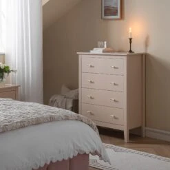 - Complete the look: Pictured with the Oakham Nude Pink Chest of 4 Drawers is our Atlan Cream & Taupe Handwoven Wool Runner, Juliette Camel Paisley Reversible Quilted Cotton Bedspread and Margot Rose Pink Embroidered Scallop Duvet Set.