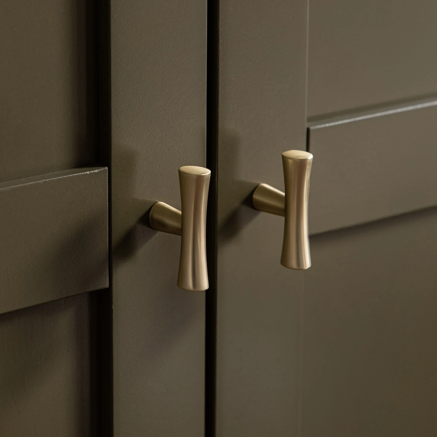 - The clean silhouette, recessed panels, and gold-tone T-bar handles create a look that feels quietly refined, not overstated.