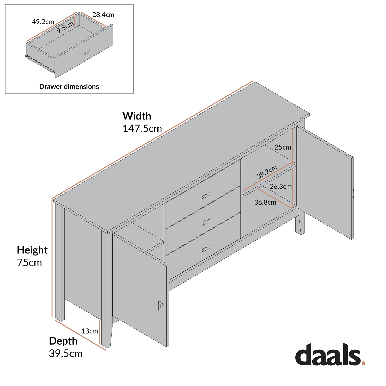 - Three central drawers run smoothly on metal gliders, perfect for cutlery, tech accessories or daily bits and bobs.