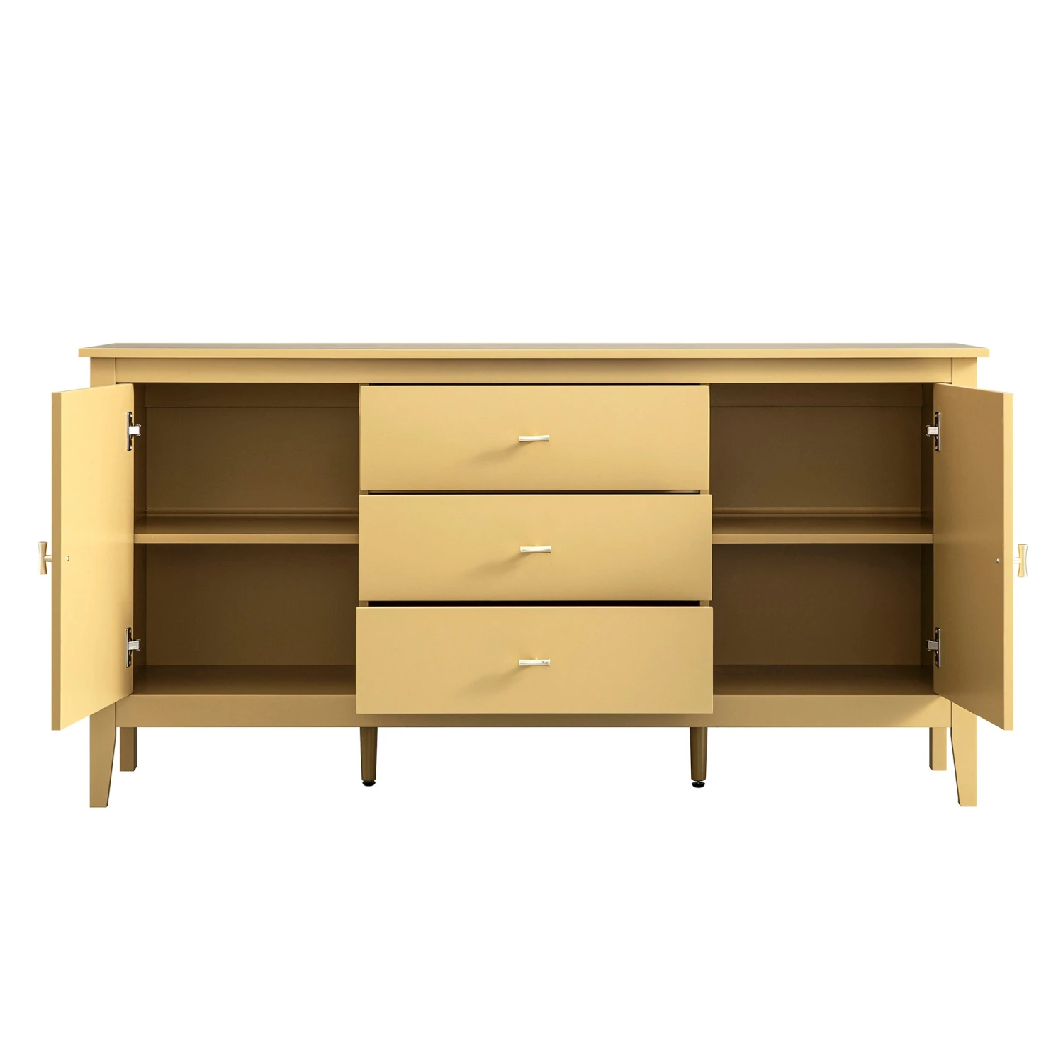 - Playful yet composed, the Oakham wide sideboard in rattan yellow brings a sun-warmed charm to your living or dining space.