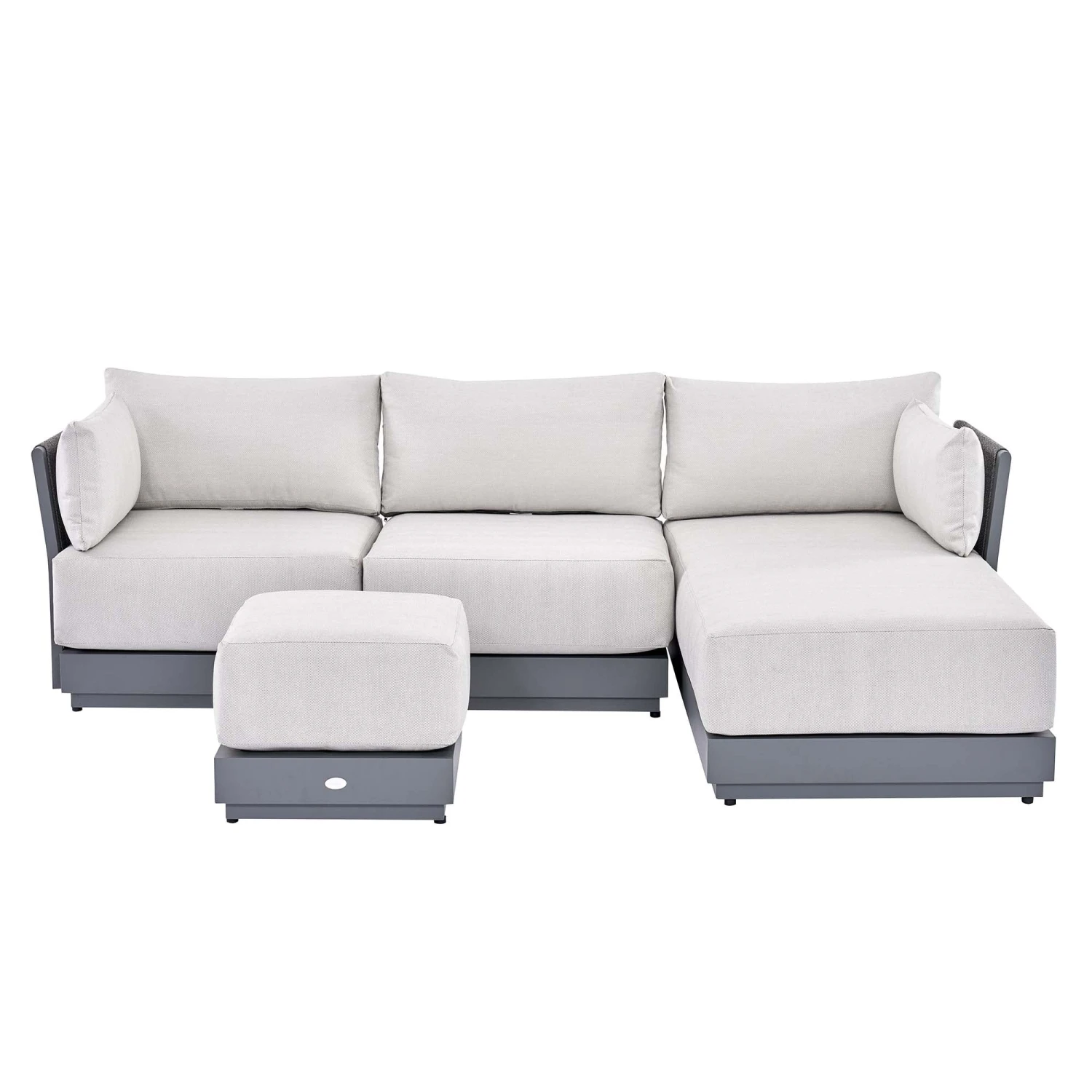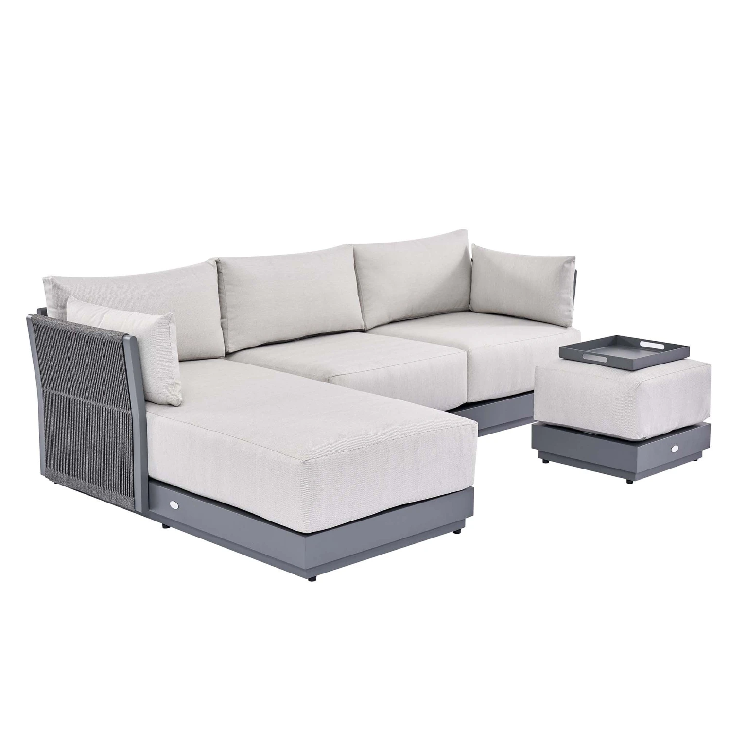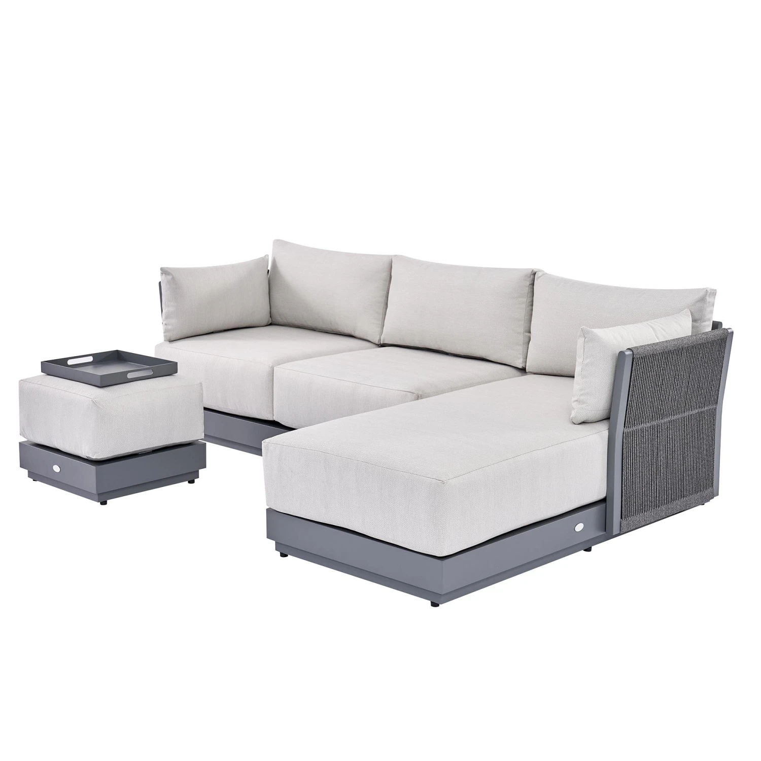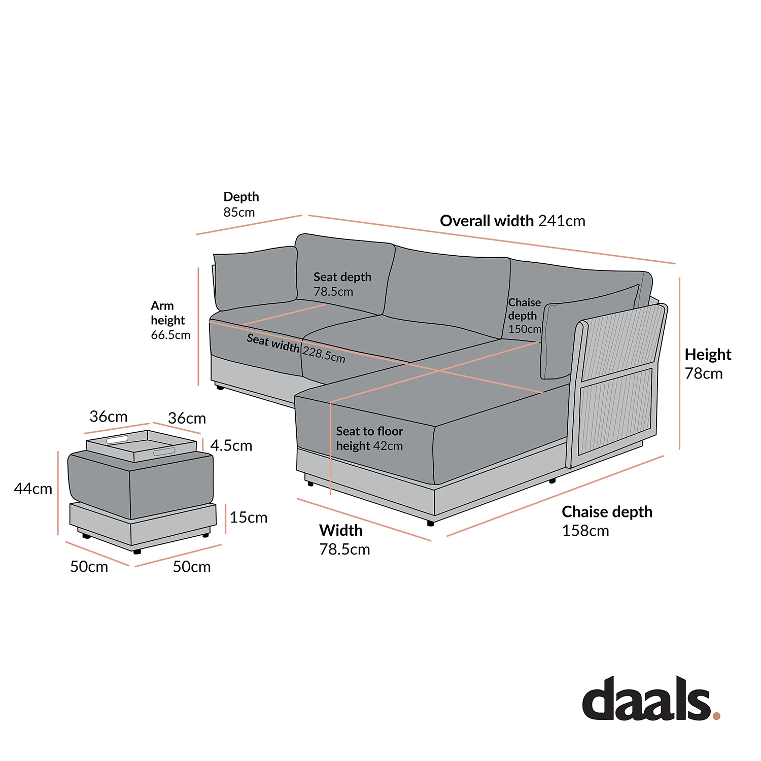- Set Includes: 1 x Reversible 2-Seater Sofa, 1 x Chaise Lounger, 1 x Footstool with Tray