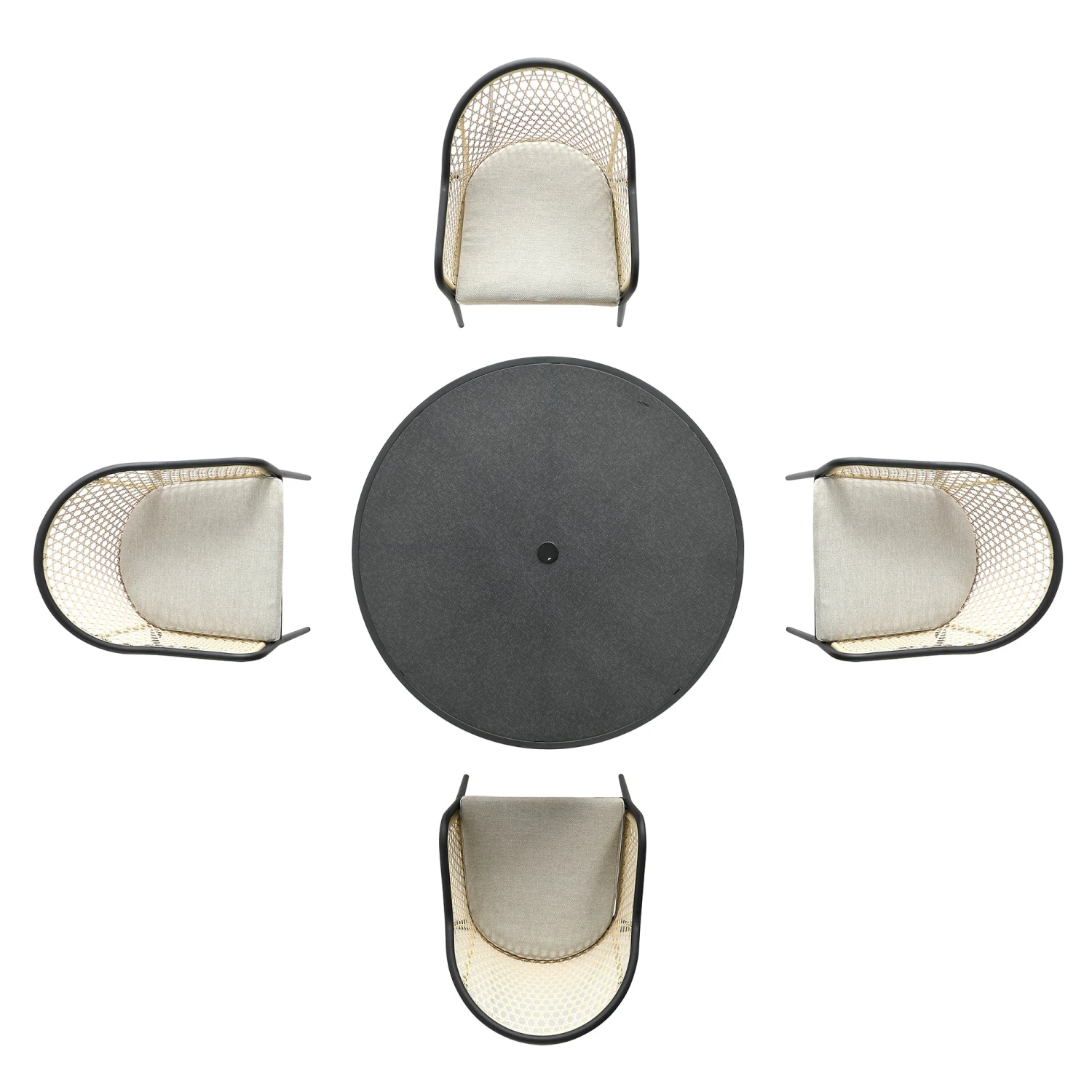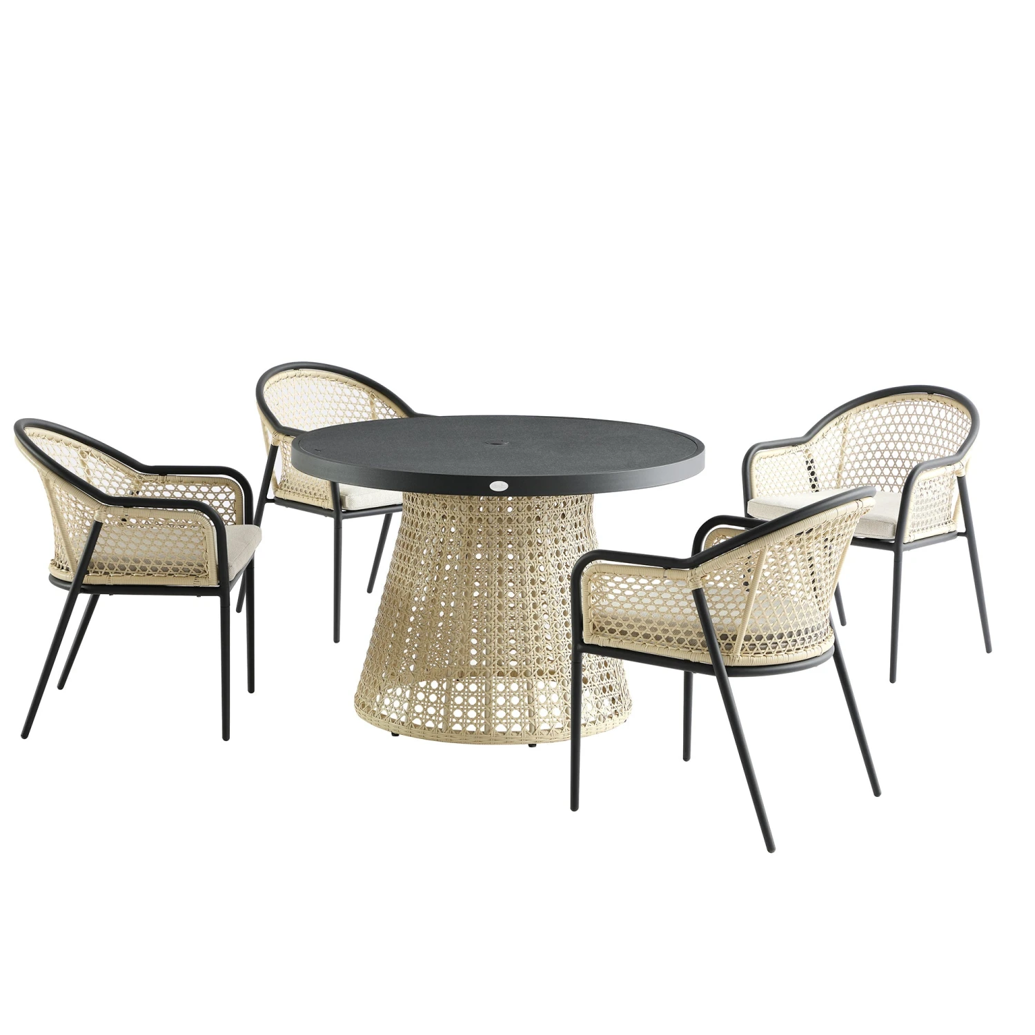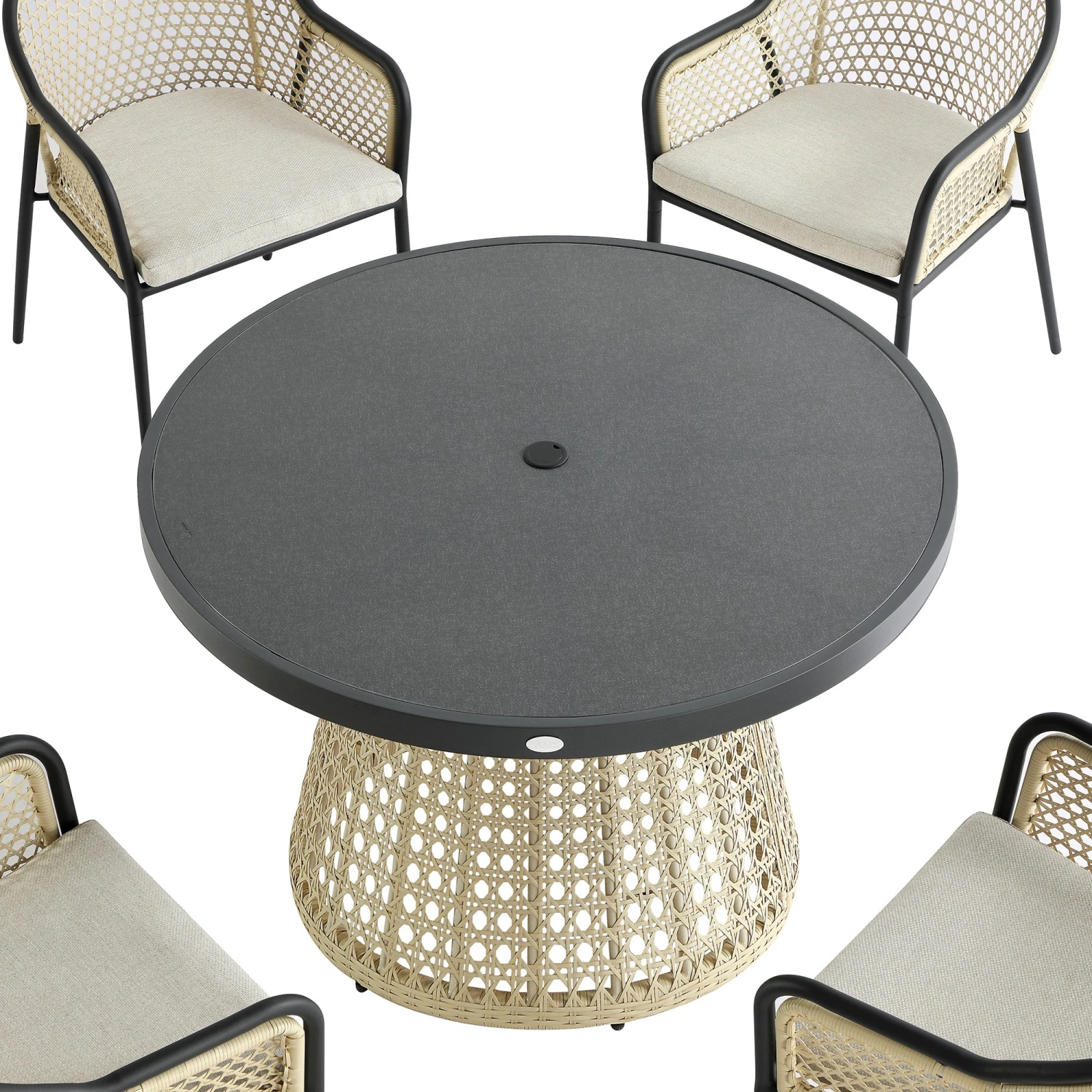 The set features a 110cm round dining table with a tempered glass top uniquely printed with a black stone effect, designed to perfectly coordinate with the black open-weave PE rattan. The four carver dining chairs are expertly crafted with slightly reclined backs for maximum comfort, utilizing high-quality UKFR weather-resistant fabrics that ensure durability without sacrificing the plush feel of indoor furniture.