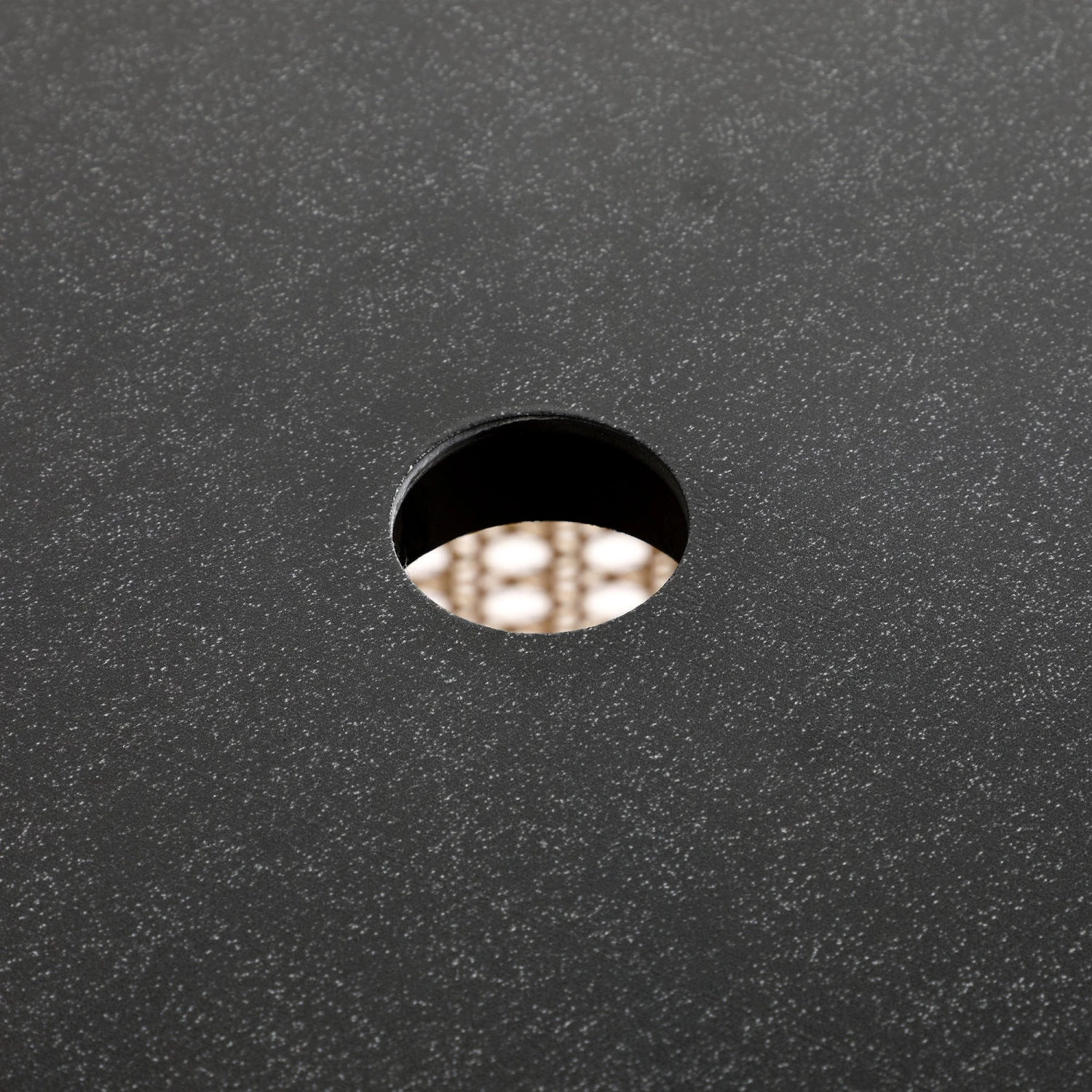 - Unique Table Top: 110cm round tempered glass with a sophisticated black stone-effect print and 38mm parasol hole.