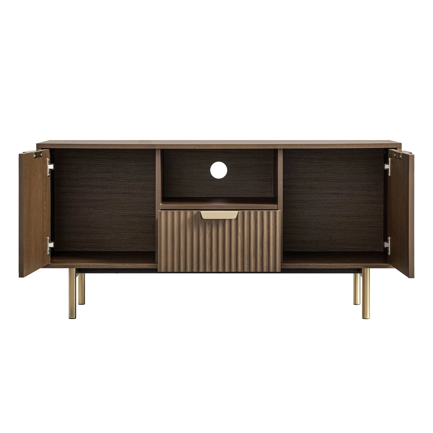 - The 120 cm wide TV unit features ribbed front finished in light stain, complete with contrasting gold effect handles and legs.