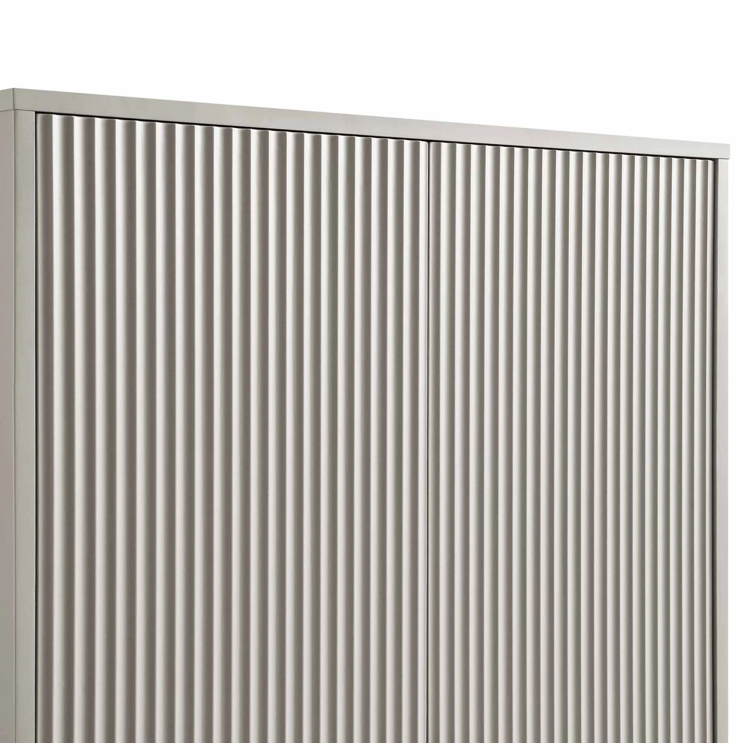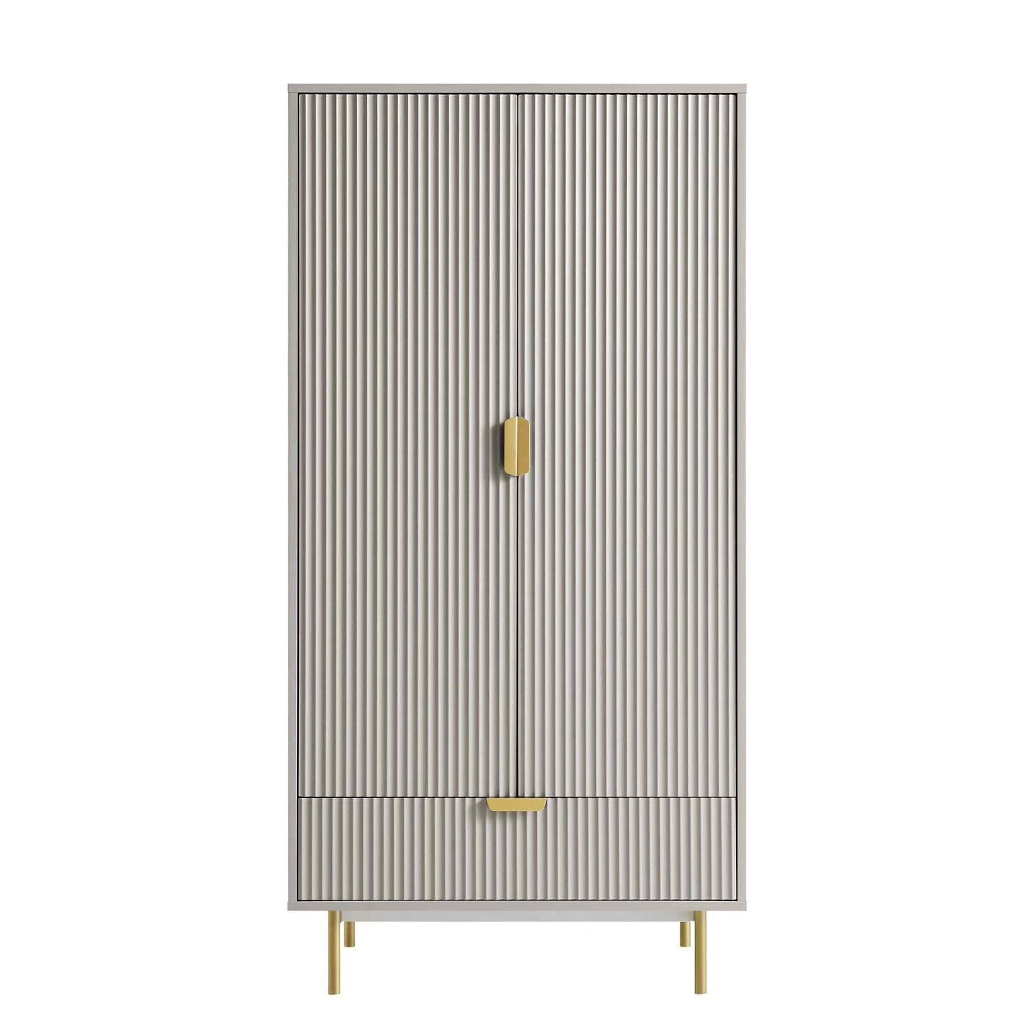 - Theย wardrobe features stylish ridged doors and drawer front finished in matteย taupe paint, paired with gold handles and legs