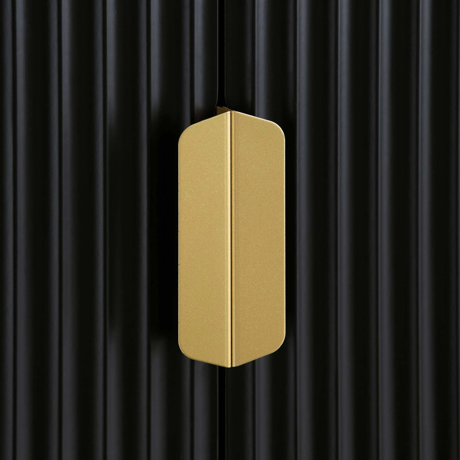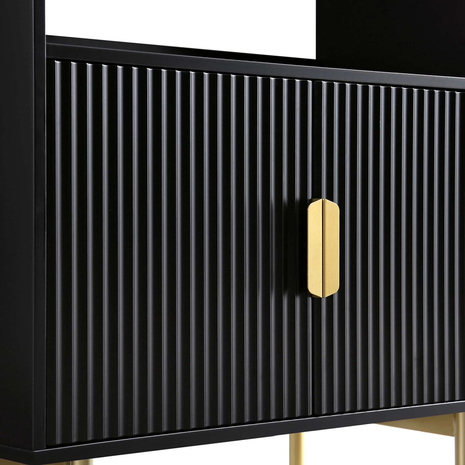 - The bookcase features ridged door surface finished in matte black paint, paired with gold handles on the doors and matching legs.