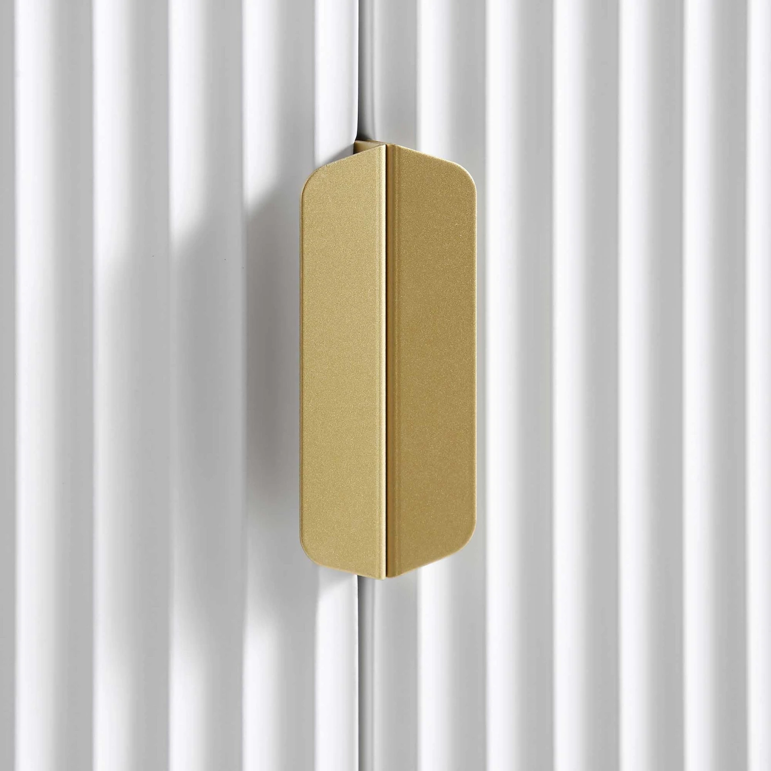 - The bookcase features ridged door surface finished in matte white paint, paired with gold handles on the doors and matching legs.