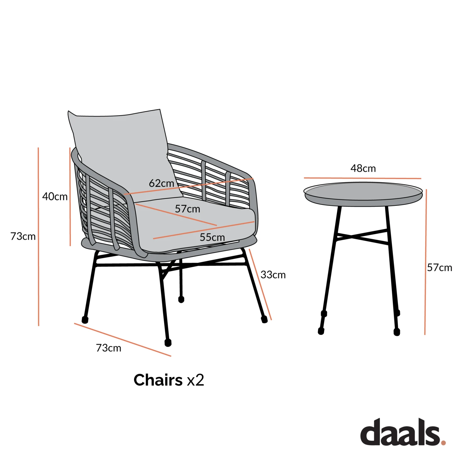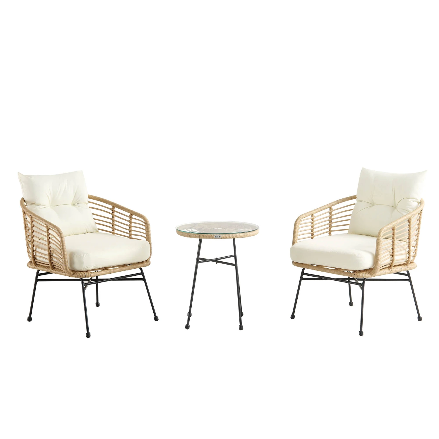 Set Includes: 2 Armchairs (W 62 x D 73 x H 73 cm) and 1 Glass Top Table (W 48 x H 57 cm). Assembly Required. SKU: OD-BISTR-024.