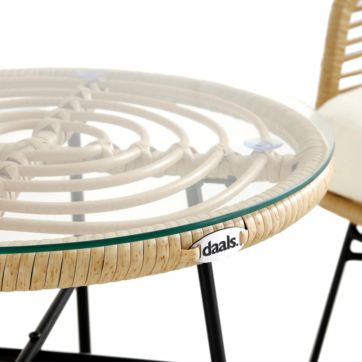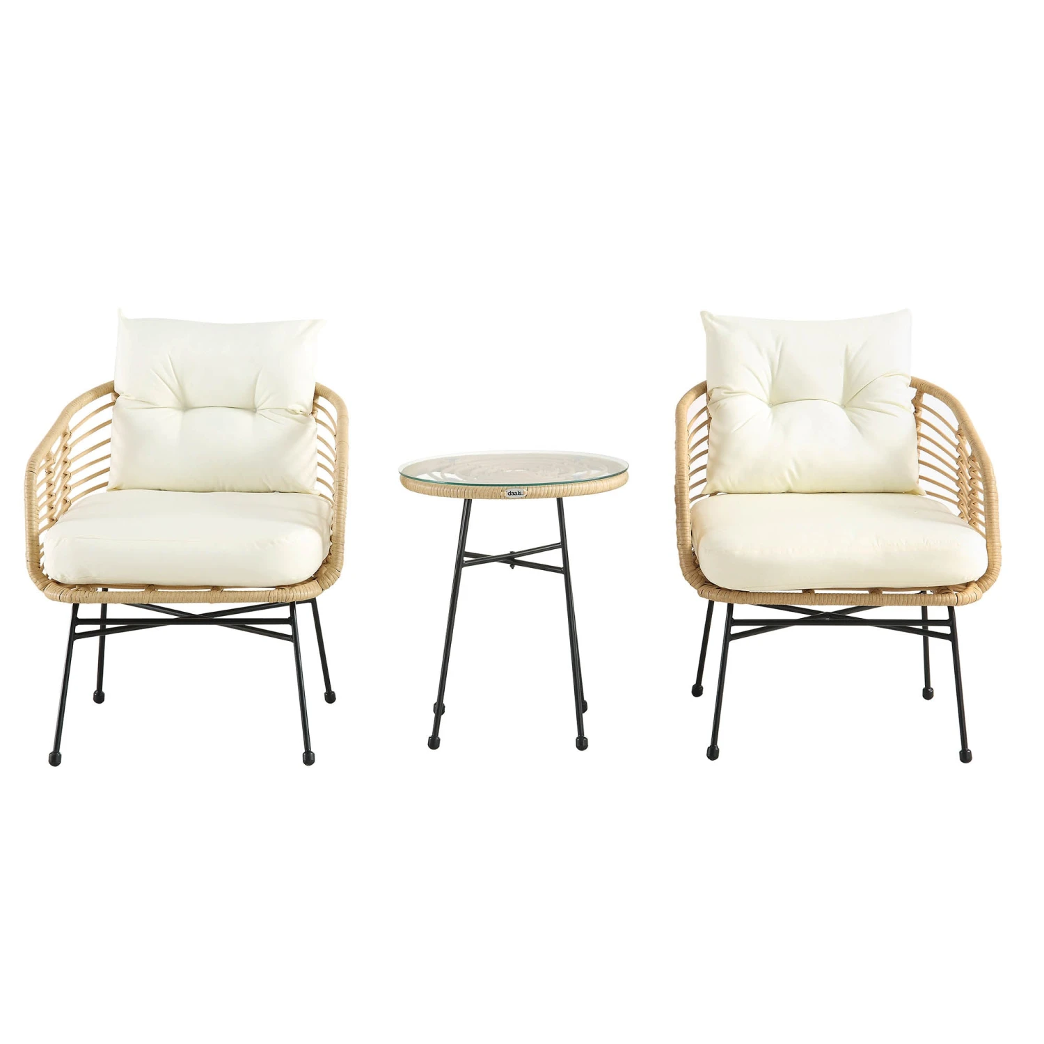 Elevate your garden with the St Loy Natural Rattan Bistro Set, a perfect blend of modern aesthetics and classic comfort. This handwoven PE rattan set features two ergonomic armchairs with cream-colored back and seat cushions, supported by stylish black powder-coated legs. The set is completed with a matching round table featuring a 5mm toughened glass top, ideal for holding drinks or books.
