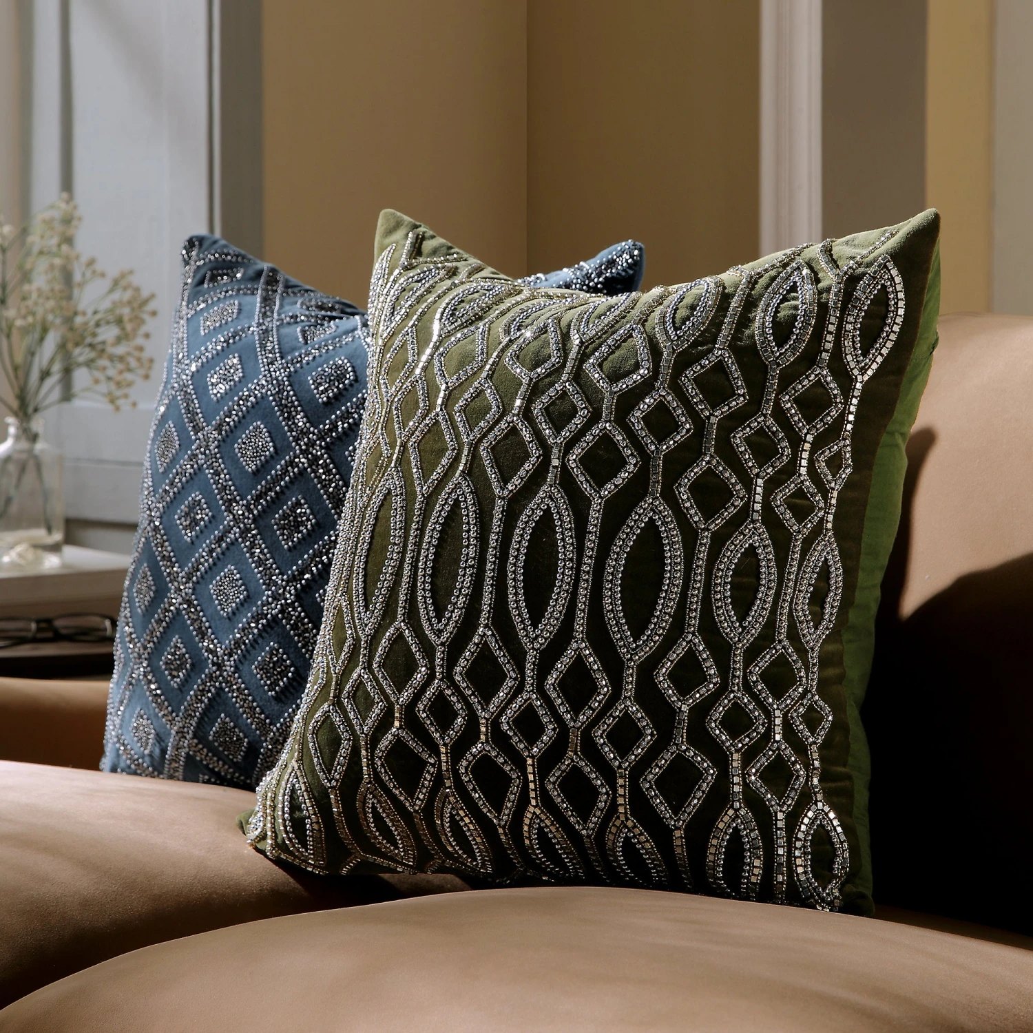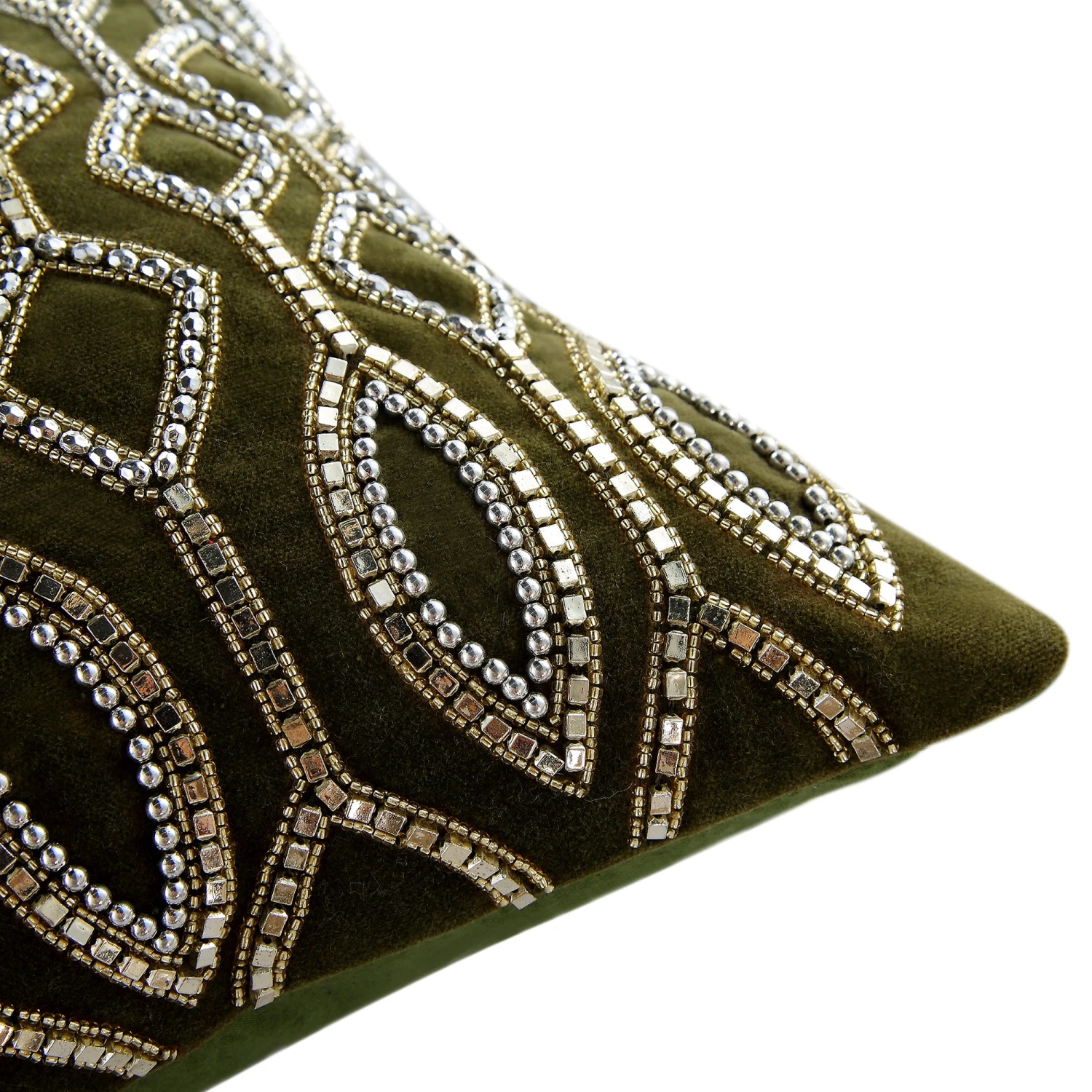 The Verona cushion features a deep, earthy moss green 100% cotton velvet base that provides a rich, tactile experience. The front face is adorned with hand-stitched silver beading in a bold geometric pattern, offering a stunning contrast against the lush fabric. For versatility, the reverse features plain moss velvet, allowing you to switch between high-drama and understated elegance.