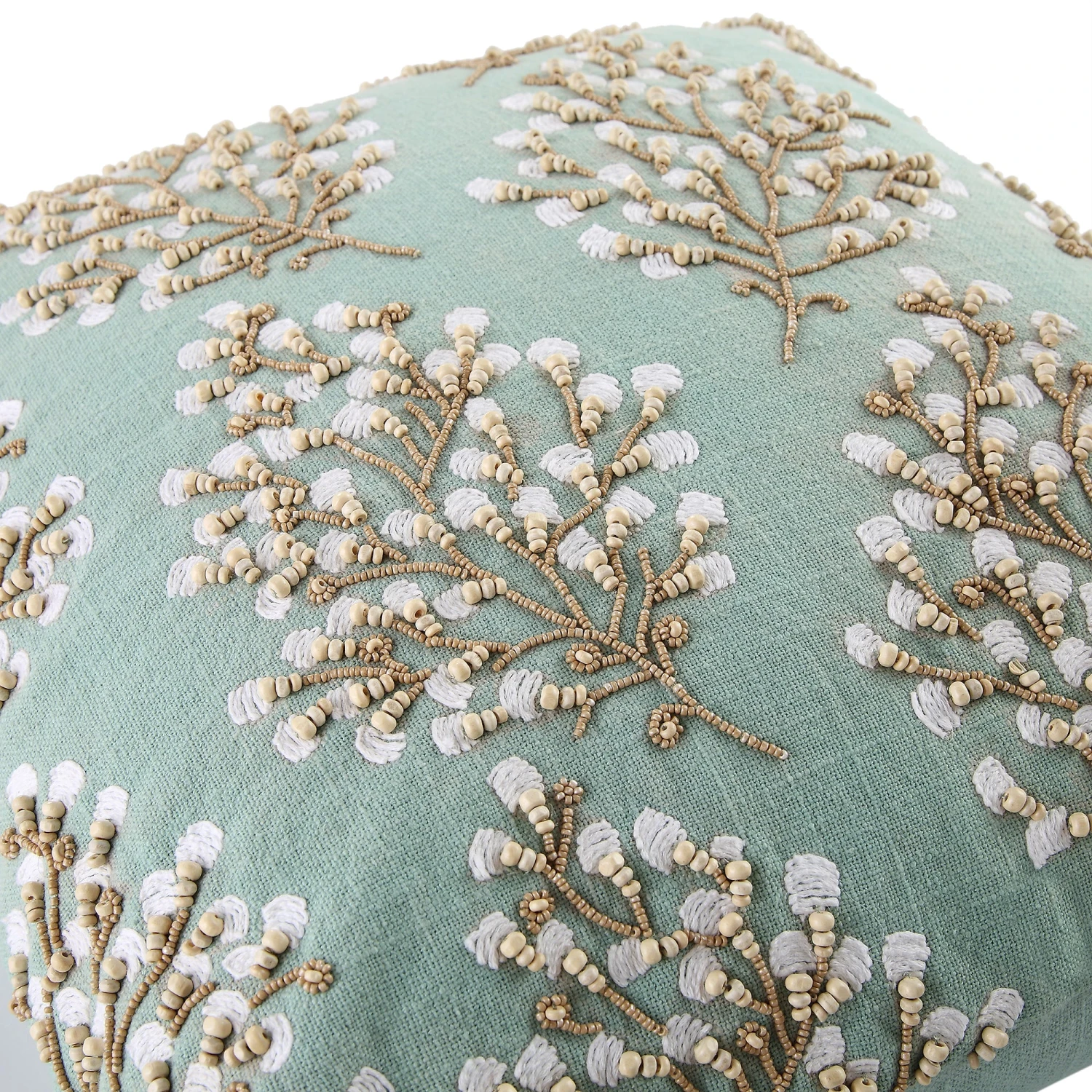 This cushion showcases a stunning teal blue cotton slub base, celebrated for its natural uneven knots and textured surface. The design is elevated by hand-applied wooden beads and specialized couching stitches in thick cotton yarn. Bold, thick-edge tassels frame the piece, providing a tactile and luxurious finish that stands out on any sofa or bedding.