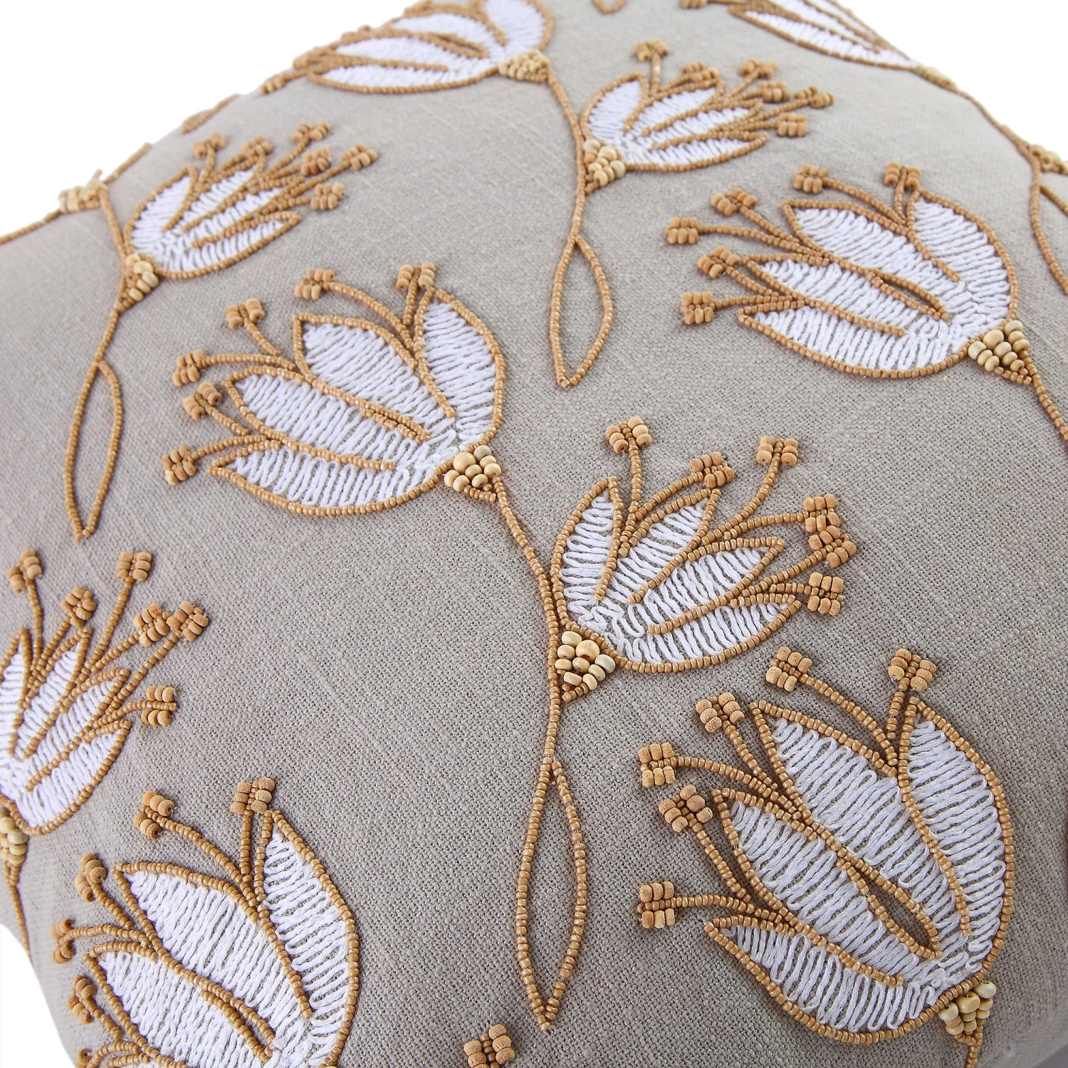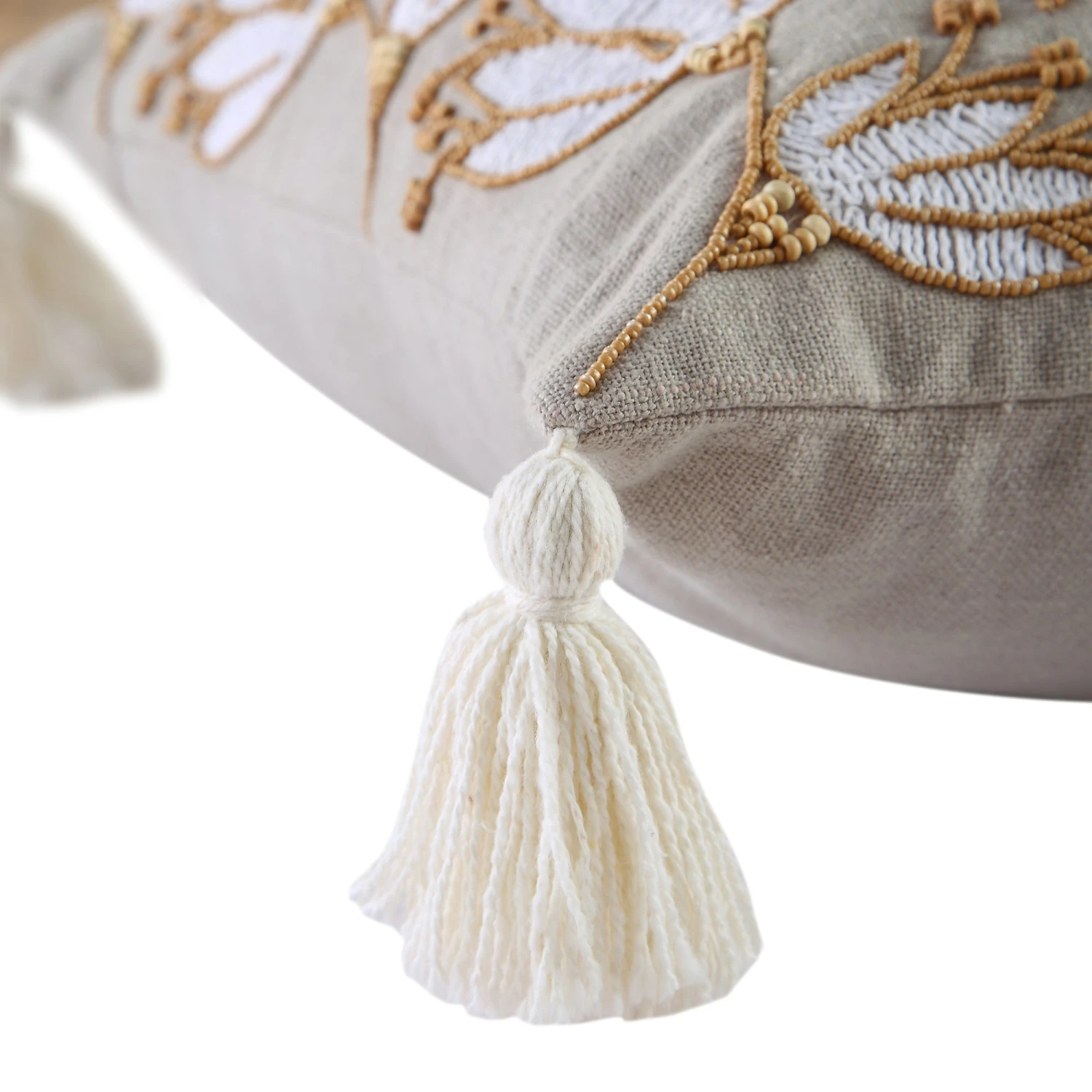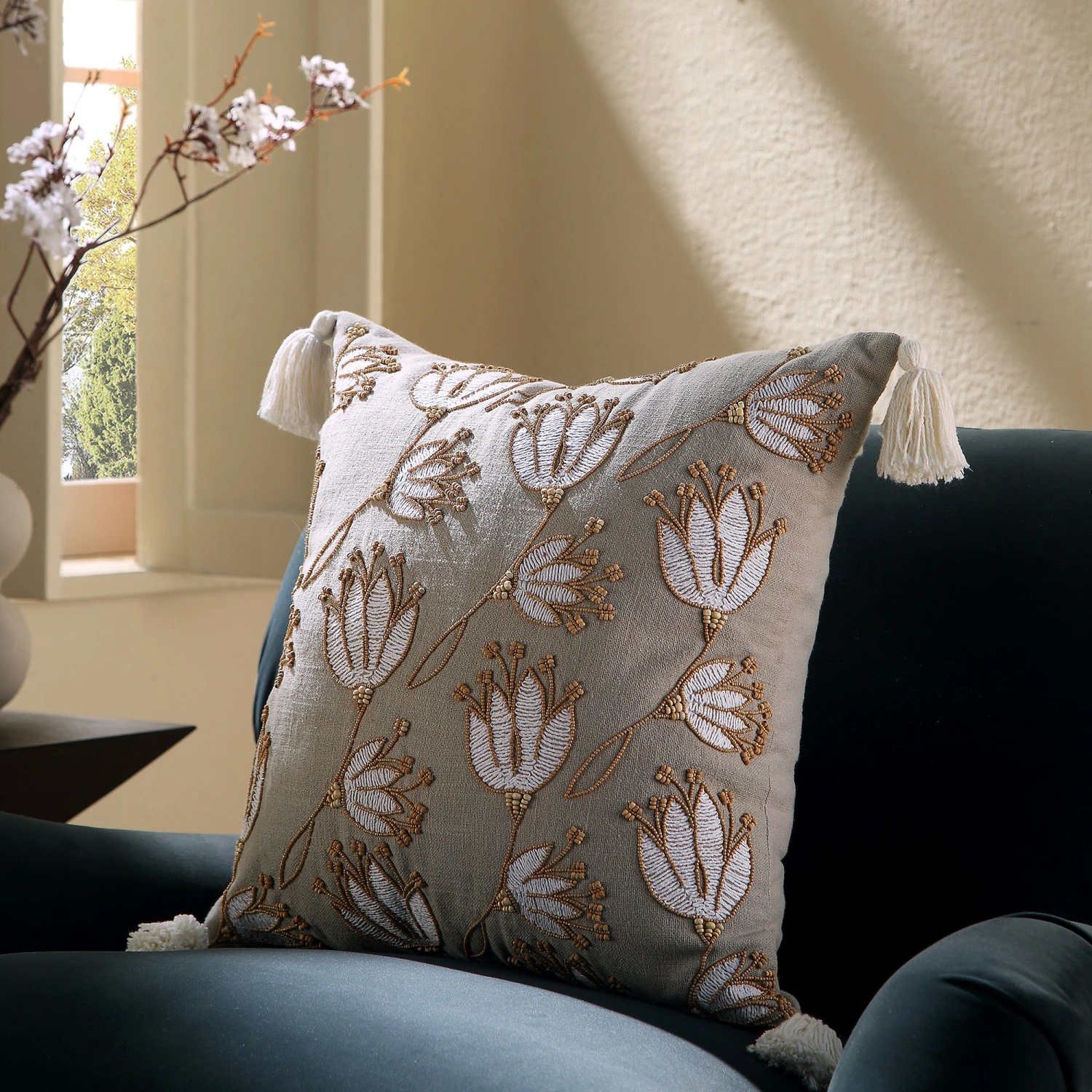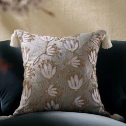 Set against a light grey cotton slub baseβcelebrated for its characteristic natural knots and raised threadsβthis cushion features a stunning floral design. The artwork is brought to life through specialized couching stitches in thick cotton yarn, accented by genuine wooden beads and framed by chunky, thick-edge tassels that add a bohemian touch to any sofa or bedding arrangement.