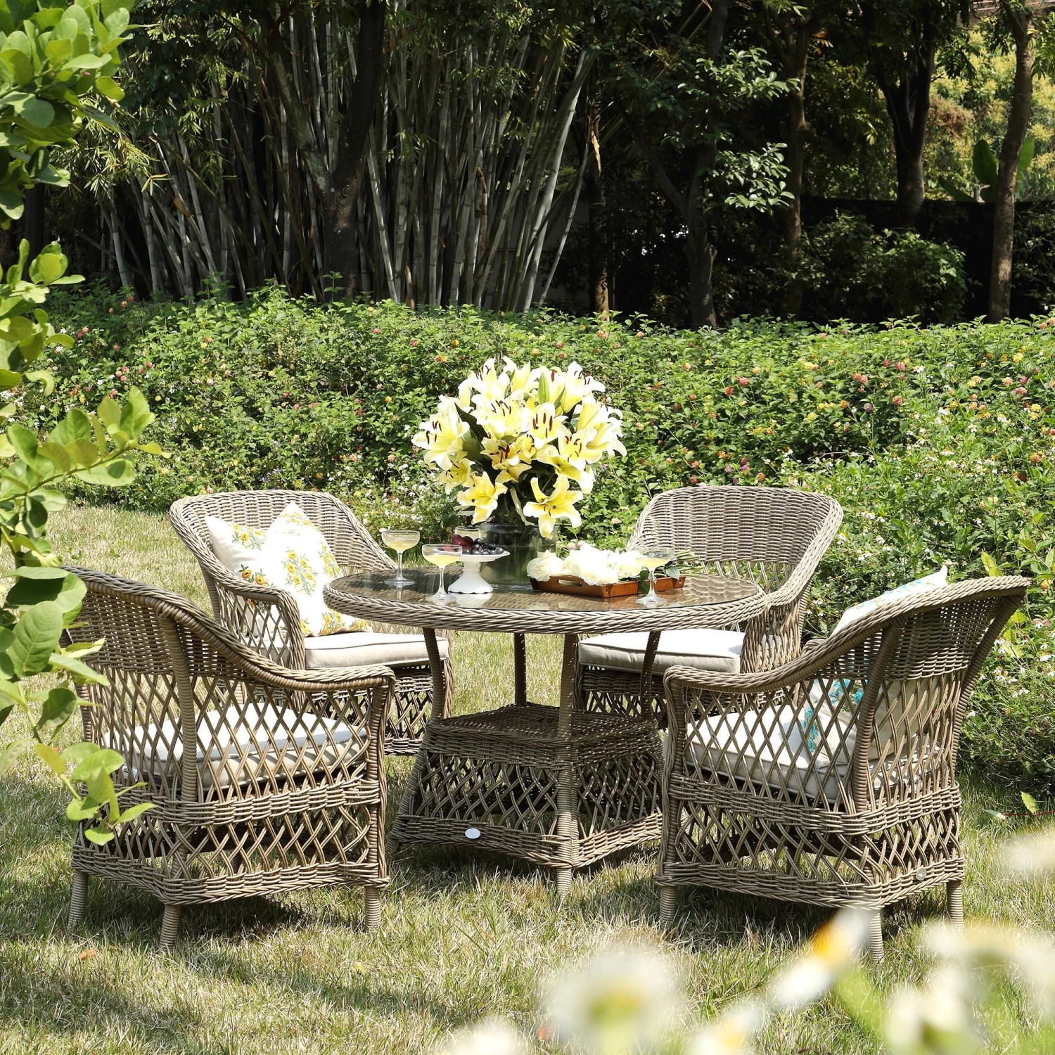 - Complete the look:ย Pictured with the Willowbrook Lattice Weave Rattan 4-Seater Round Dining Set, Natural, is our Indra Mughal Sundance Yellow Wool Embroidered Cushion.