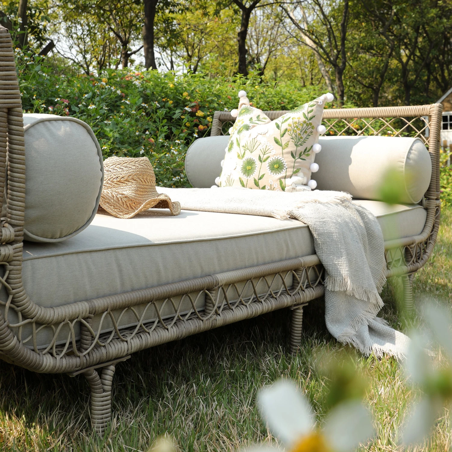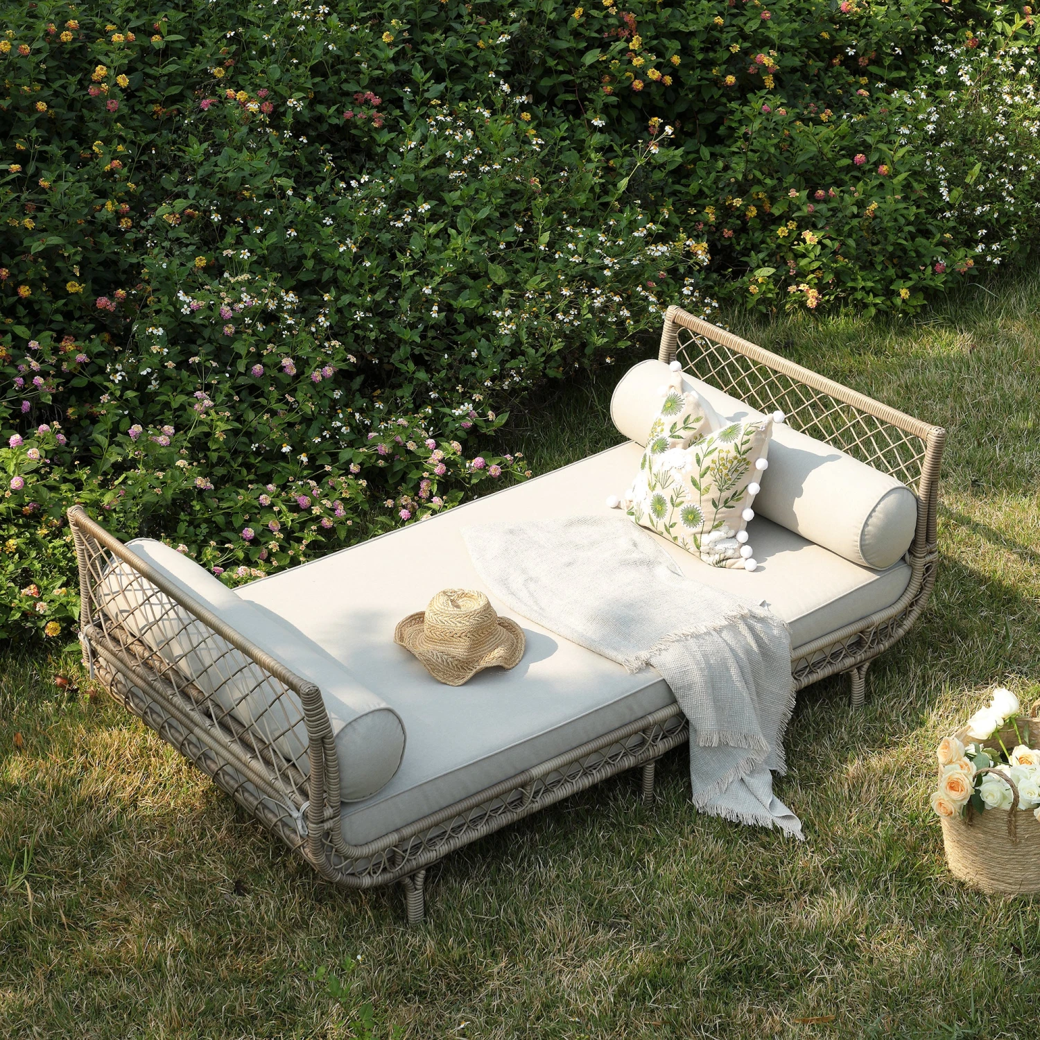 - Featuring robust round poly-rattan weaves hand-wrapped around aluminium frame, our Willowbrook daybed is a dreamy piece for your various outdoor and indoor settings.