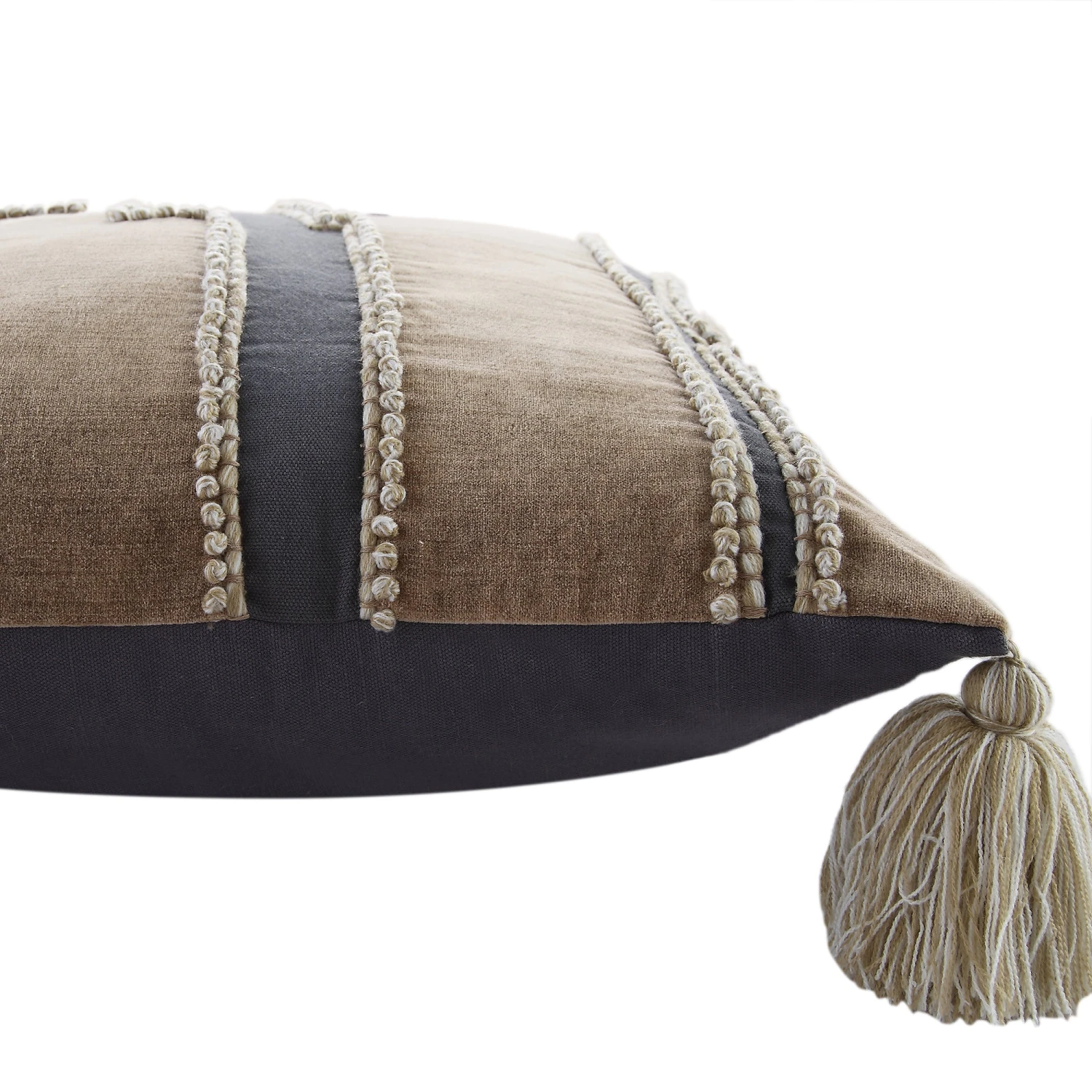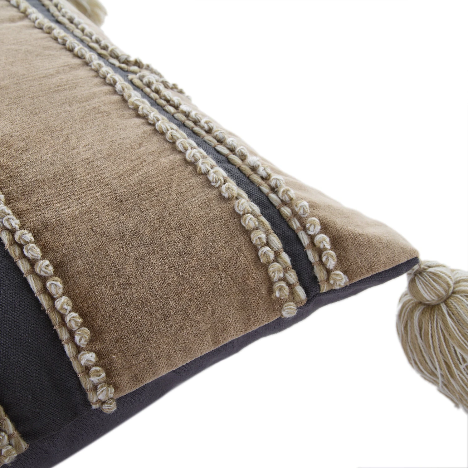 The Wylder cushion features a sophisticated multi-textured patchwork face, utilizing enzyme-washed velvet to achieve a distinctively soft, vintage-worn aesthetic. The base is crafted from premium cotton slub, where natural knots and raised threads create an organic, hand-loomed feel. Every detail is considered, from the intricate embroidery and French knots to the artisanal wool tassels that frame the piece.