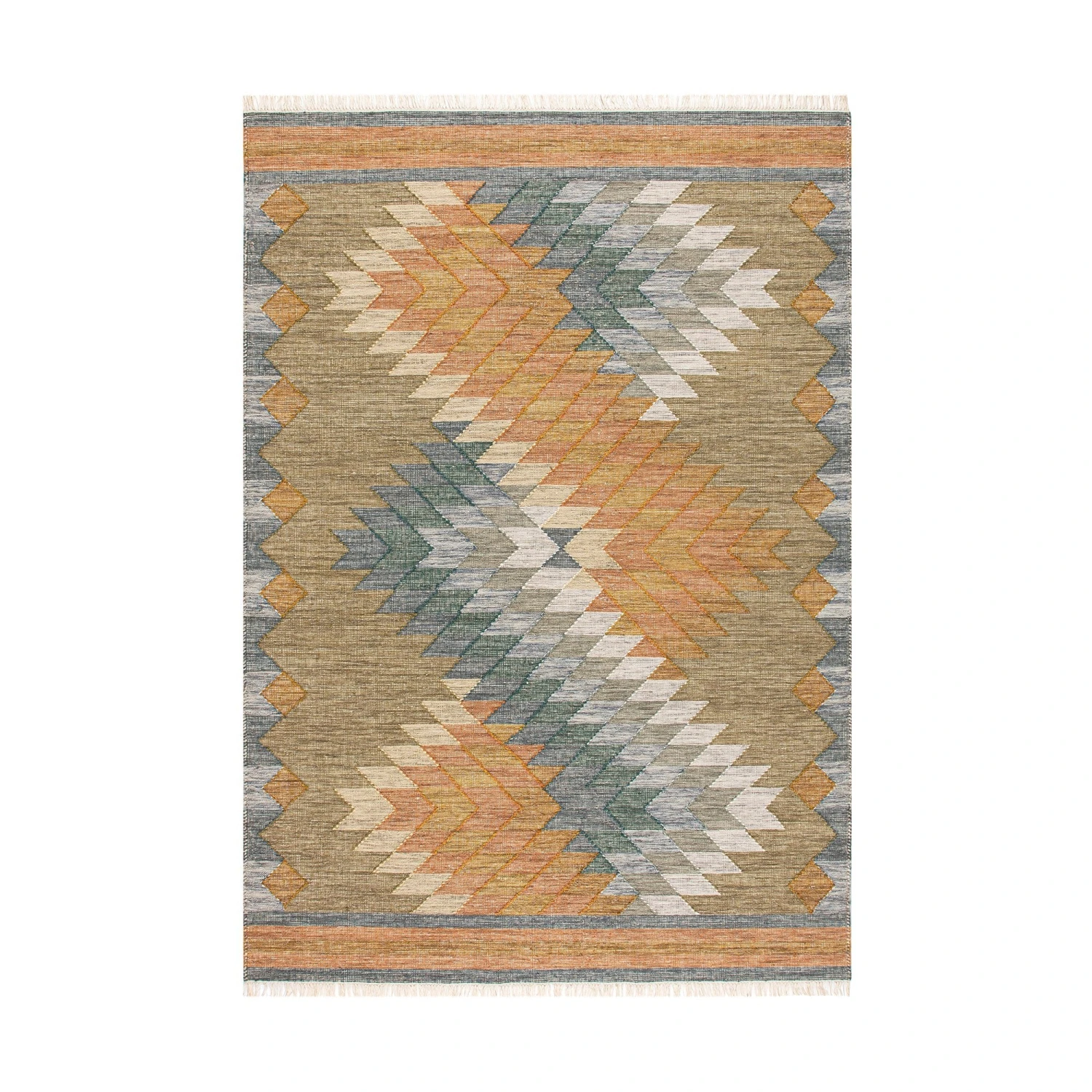 This Kilim rug boasts a rich geometric pattern in earthy orange and cool blue tones, beautifully complemented by its natural green base. The design is finished with delicate tassels that add character and an authentic handmade feel to the edges. Its lightweight, no-pile construction makes it a versatile choice for high-traffic areas or minimalist interiors.